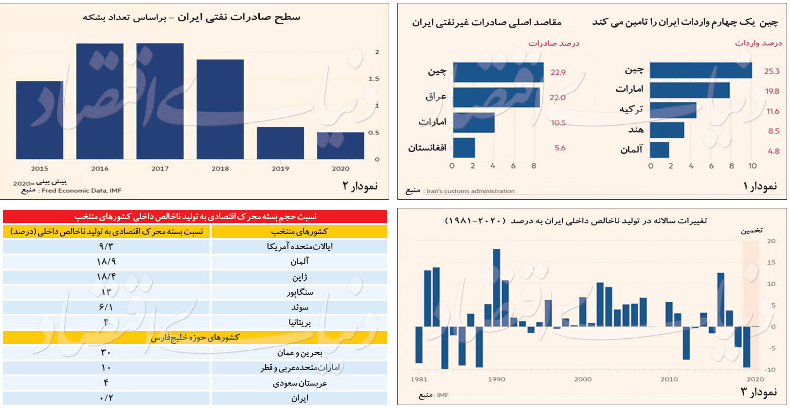 برآورد اقتصاددانان آن است که در شرایط بدبینانه، احتمال سقوط تولید داخلی ایران به دوسوم میزان فعلی (کاهش ۳۳ درصدی) و کسری بودجه حدود ۱۰ میلیارد دلاری در سالجاری وجود خواهد داشت.