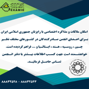 امکان ملاقات و مذاکره اختصاصی با رایزنان جمهوری اسلامی ایران بـرای اعـضای انجمن صـادرکنندگان در کشـورهای مختلف نظـیر چـین ، روسـیه ، هـند ، ایـتالـیا و … فراهم گردیده است.خواهشـمند است جهت کسـب اطلاعات بیـشتر با دفتر انـجمن تمـاس حاصـل فرمائیـد.