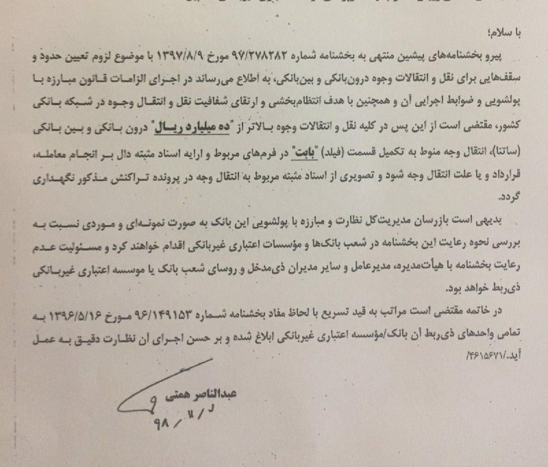 بخشنامهپیرو بخشنامه های پیشین منتهی به بخشنامه شماره 97/278282 مورخ 97/08/09 با موضوع لزوم تعیین حدود و سقف هایی برای نقل و انتقالات وجوه درون بانکی و بین بانکی، به اطلاع می رساند در اجرای الزامات قانون مبارزه با پولشویی و ضوابط اجرایی آن و همچنین با هدف انتظام بخشی و ارتقای شفافیت نقل و انتقال وجوه در شبکه بانکی کشور منقضی است از این پس در کلیه نقل و انتقالات وجوه بالاتر از ده میلیارد ریال درون بانکی و بین بانکی (ساتنا)، انتقال وجه منوط به تکمیل قسمت (فیلد) بابت در فرمهای مربوط و ارائه اسناد مثبته دال بر انجام معامله، قرارداد و یا علت انتقال وجه شود و تصویری از اسناد مثبته مربوط به انتقال وجه در پرونده تراکنش مذکور نگهداری گردد.