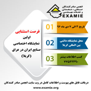نمایشگاه اختصاصی صنایع ایران در عراق (کربلا) از تاریخ 4 الی 7 دی ماه 96 در محل نمایشگاه دائمی بین المللی کربلا توسط شرکت نما گستر آدونیس و با حضور صنایع غذایی ، فرش ماشینی و دستباف ، مبلمان منزل و اداری، ساختمان ، پلاستیک ، غذای حلال ، لوازم التحریر ، سنگ و سرامیک ، گیاهان دارویی،تاسیسات ساختمان برگزار میگردد.
