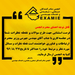 قابل توجه اعضای محترم انجمن فرصت استثنایی جهت طرح سوالات و نقطه نظرات شما درجلسه کاری با جناب آقای مهندس جهرمی وزیر محترم ارتباطات و فناوری خواهشمند است نقطه نظرات و مسائل مورد نظر و مرتبط خود را حداکثر تا تاریخ96/8/27 کتبا به انجمن ارسال فرمائید.